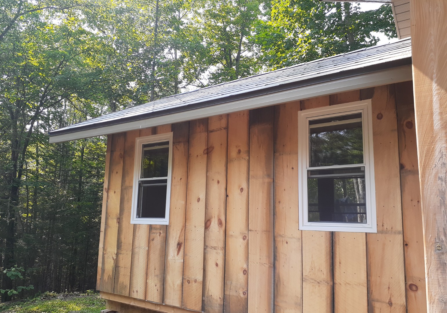 The board and baton siding on the KC and main cabin is larely done (some small sections and trim left to tackle).